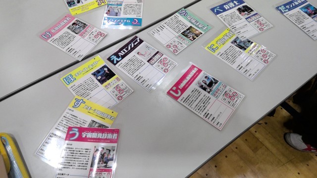 次の時間は体育館でかるたゲームを行いました。そのかるたに①職業、②仕事の概要、③価値観などの情報が書かれています。自分が希望した職業と価値観が似ていた、この職業知らなかったなどと言いながら楽しく活動しました。