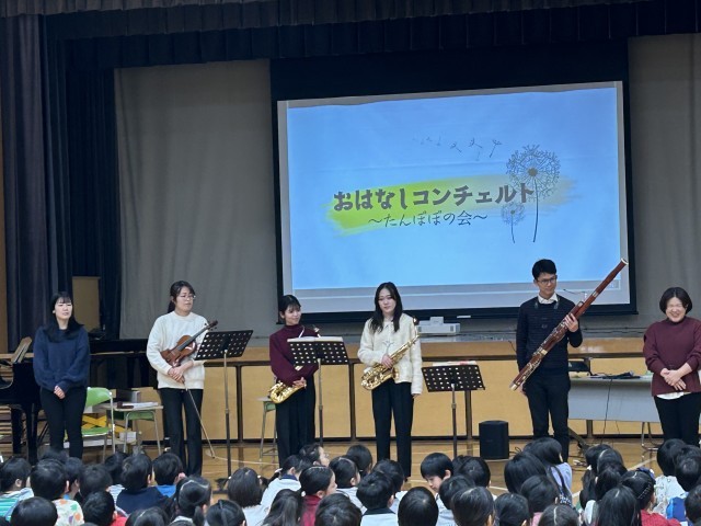 12月15日(月)3時間目、洗足学園音楽大学「たんぽぽの会」の方々を講師として、絵本の読み聞かせと音楽を融合させた「お話コンチェルト」を行いました。素敵な楽器の演奏に合わせて、「手ぶくろ」「うかぶかな?しずむかな?」「ずうっとずっと大すきだよ」の読み聞かせなどを聞き、いつもに増して本の世界にひたりながら、楽しんでいました。