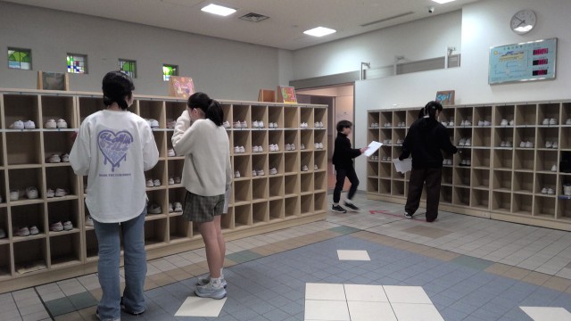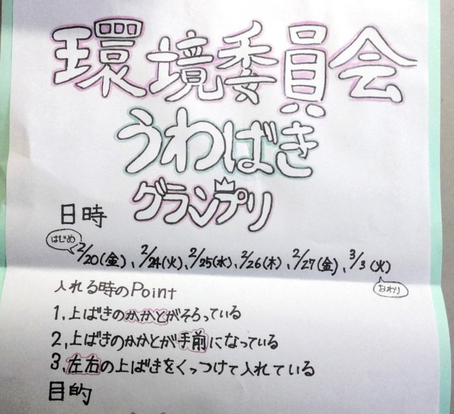 環境委員会の児童が、学校の課題について考え、「靴箱をきれいにしたい。上履きを整えて入れられるとよいのではないか。」という意見から上履きグランプリを実施しました。