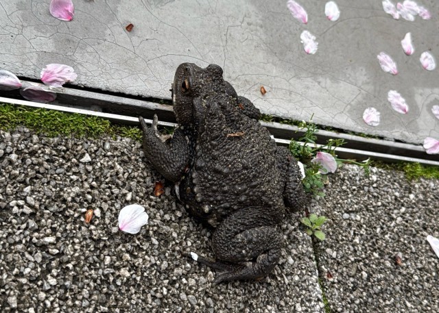 満開の桜のもと、令和8年度が始まりました。校庭では、冬眠から目覚めたカエルが散歩しており、本校の春の風物詩となっています。