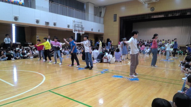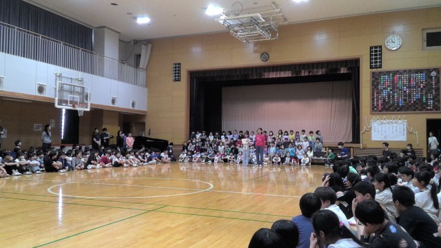 4月20日(月)3時間目、1年生を迎える会を行われました。1年生は、2年生が手作りしたメダルを首から下げ、全校児童の大きな拍手の中、体育館へ入場しました。6年生はこの日のために、様々な工夫を凝らして企画・準備をし、学校でのきまりや行事などを音楽に合わせて楽しく紹介しました。1年生からは、お礼に元気な「さんぽ」の歌のお返しがあり、たくさんの笑顔あふれる会になりました。