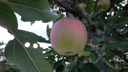 石田農園さんでりんご狩り体験。写真にある、まるで桃のような「未熟リンゴ」。スーパーでは見られませんね。