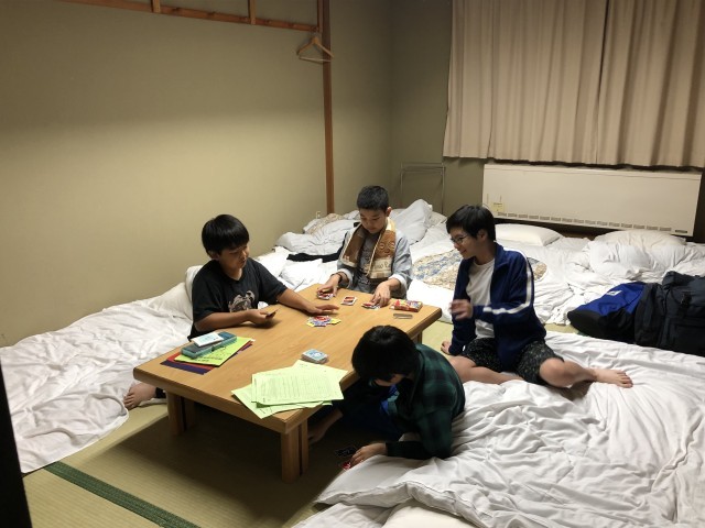 馬レース、トランプ、UNO、これから何をしようか考え中の部屋など過ごし方は様々です。友達と部屋でゆっくり過ごすのも、いい思い出となることでしょう。どの部屋もたくさんの笑顔が見られました。今日の更新はここまでとします。おやすみなさい。明日はいよいよ最終日です。