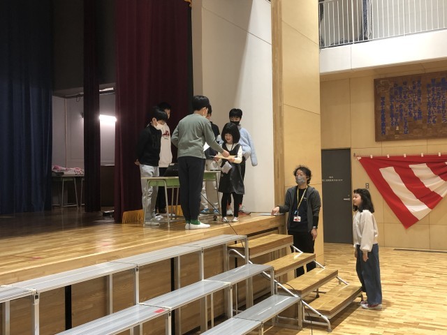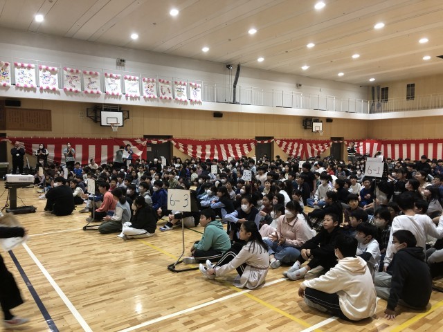 毎年この時期恒例のフレンズ班(縦割り班活動)によるビンゴゲームが行われました。運動会や音楽会、遠足、社会科見学、理科見学、書き初め大会など、1年間のできごとをみんなで振り返り、体育館中が温かい雰囲気に包まれました。