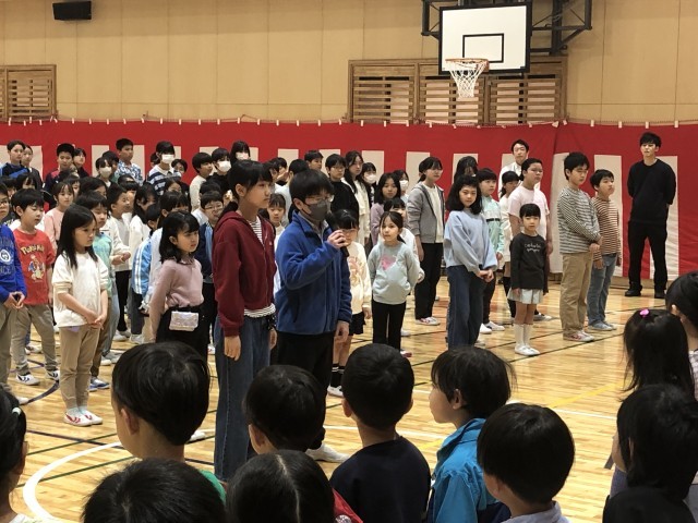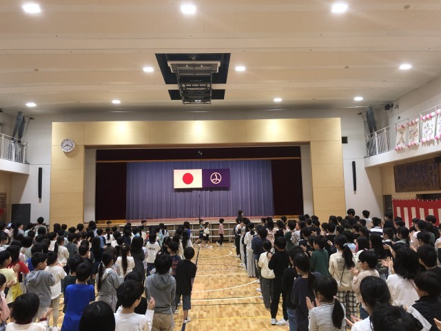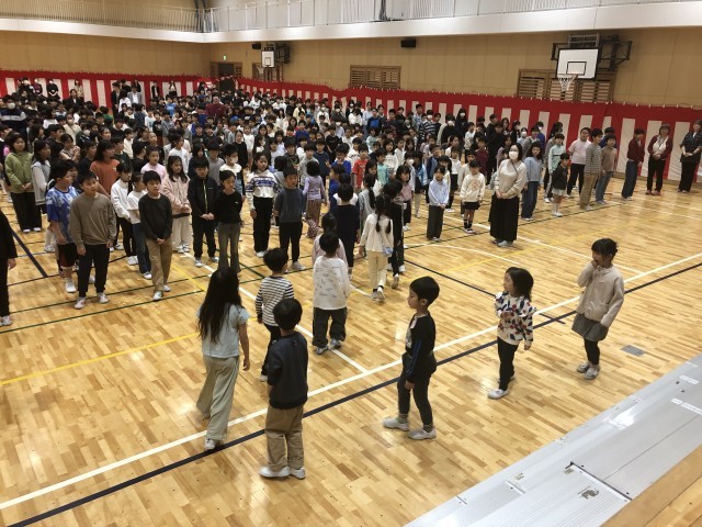1年生が初めて、2年生から6年生に会いました。盛大な拍手の中、入場した1年生は緊張しながらも、笑顔が見られました。6年生の代表からは歓迎の言葉がありました。1年生からは、対面式をしてくれたことへの感謝の言葉「ありがとうございます」と「これからよろしくお願いします」のあいさつがありました。入学して4日目の1年生からのとても上手なあいさつにみんなは驚きました。最後は1年生が全校で集まる時の並ぶ位置を確かめました。1年生から6年生のみなさん、大変よくできました。