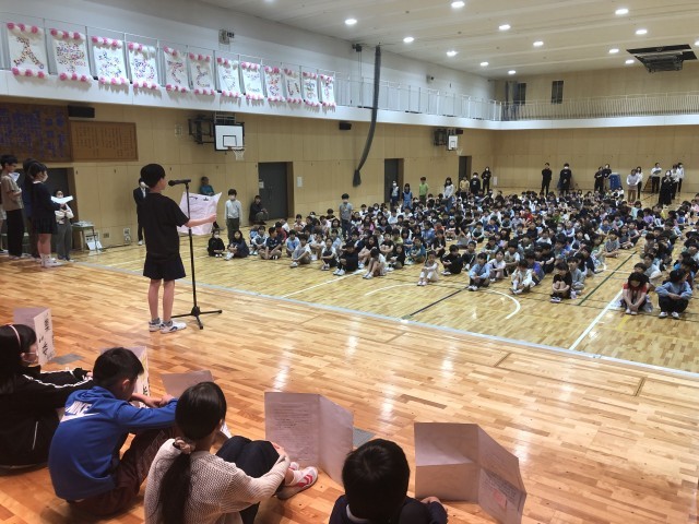 よりよい学校生活を送るために運転、環境、集会、図書、放送、保健、給食、飼育、代表の9つの委員会活動があります。今年から1年間を通した活躍が楽しみです。各委員会の活動内容とみんなに協力してほしいことを各委員長が呼びかけていました。