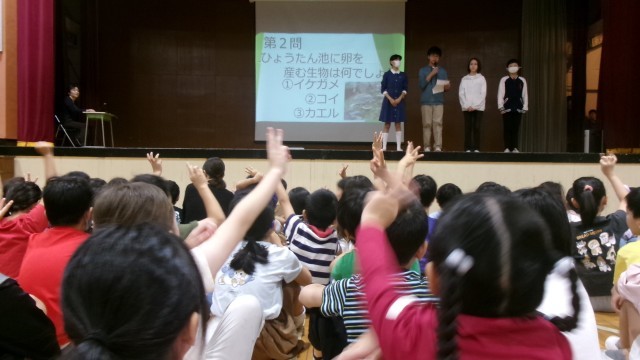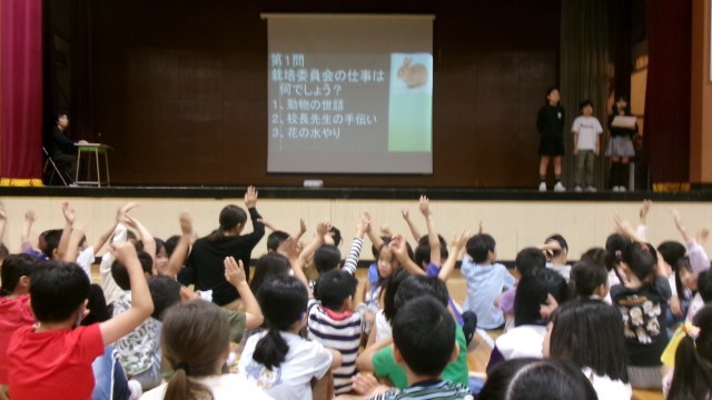 本日、全校児童が一堂に会し、栽培委員会による発表集会を行いました。委員会の児童たちは、クイズ形式を通して、栽培委員会の活動内容や学校に息づく自然・資源について、楽しく、そして分かりやすく紹介してくれました。 「栽培委員会の仕事は?」「ひょうたん池に住む生物は?」「昭和26年の記念樹は?」「世界の花の種類は?」など、子供たちの興味を引く問いかけが続き、会場は驚きと発見に満ちた温かな雰囲気に包まれました。発表を通して、学校にある自然の豊かさや、先人たちが残してくれた記念樹の尊さに思いを馳せる機会となりました。特別活動の一環として行われている委員会活動は、児童一人一人が自らの役割を果たし、学校生活をよりよくするために主体的に取り組む貴重な学びの場です。今回のように、全校児童の前で発表する経験は、発表者にとって大きな自信となり、聞き手にとっても仲間の努力や工夫に気付く機会となります。これからも、子供たちが互いに学び合い、協力し合いながら、豊かな学校生活を築いていけるよう、教職員一同、心を込めて支えてまいります。