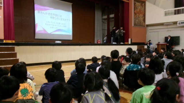 本日、本校では健康委員会による発表集会を行い、全校児童が集い、健康について共に考える大切なひとときをもちました。健康委員会の子供たちは、「風邪を予防し、毎日を健やかに過ごすために、家庭でもできること」をテーマに、調べ、考え、工夫を重ねて発表しました。まず、風邪の予防には、室内の湿度を保つことや、こまめな換気が大切であることを分かりやすく伝えてくれました。また、手洗い・うがい・顔洗い・手指消毒を丁寧に行うこと、そして家庭の中でもタオルの共有を避けることが、感染を広げないために重要であることを、具体的な例を挙げながら説明しました。さらに、体の中から健康を支える視点として、体を温め、菌に負けない力を付ける食べ物についても紹介がありました。しょうがやにんにくなどの食品を取り入れること、そして十分な睡眠をとることが、日々の体調管理に欠かせないことを、全校で確認することができました。また、学んだ内容を確かめ合うクイズが出題されました。石鹸で手を洗う適切な時間や、手を拭くときの望ましい方法、熱がある時に取るべき行動、外から部屋にウイルスを持ち込まない工夫、更にはビタミンAを多く含む食べ物についてなど、どれも日常生活と深く結び付いた問いばかりでした。講堂では、子供たちが真剣に考え、うなずき合いながら答える姿が見られ、健康への意識が自然と高まっていく様子が伝わってきました。健康委員会の発表は、自分たちの学びを全校に伝えるだけでなく、「自分の体を大切にすることは、友達の健康を守ることにつながる」という大切な気付きを、学校全体で共有する機会となりました。友達の前で発表する経験は、委員会の子供たちにとって大きな自信となり、聞いている子供たちにとっても、日々の生活を振り返る貴重な学びの場となりました。これからも本校では、子供たち一人一人が、自分の健康に関心をもち、自ら考え、行動できる力を育んでまいります。御家庭におかれましても、本日の発表を話題にしていただき、健康について語り合う機会としていただけましたら幸いです。