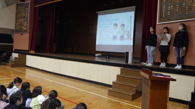 本日の全校朝会では、4年生の代表児童3名が、先日行われた「ちよだ楽」において披露した発表内容と同じ発表を、全校児童の前で堂々と行ってくれました。「ちよだ楽」とは、千代田区にある8校の小学校が一堂に会し、それぞれの学校で学んできた“千代田のよさ”や“地域の特徴”について発表し合う、大変意義深い場であります。本校の4年生は、総合的な学習の時間において探究を重ねてきた「外濠」をテーマに、歴史的背景や地域との関わり、現在に受け継がれる価値について丁寧に調べ、自分たちの言葉で分かりやすくまとめ上げました。その発表は、聞く人に地域への愛着を呼び起こすほど真摯であり、多くの学びの積み重ねが確かな自信となって表れていました。なお、「ちよだ楽」には代表児童のみが参加するため、全校児童がその学びに触れられる機会は限られております。そこで今回は、4年生の学びの成果を番町小学校全体で共有し、仲間とともに地域を見つめ、考えを深める契機としたいとの思いから、朝会での発表を実施しました。発表を見つめる児童たちの眼差しはまっすぐで、一言一句を大切に受け止めようとする真剣さが会場全体に広がっていました。友達の学びに触発され、自らの地域への興味を広げようとする姿が随所に見られ、学び合うことの尊さをあらためて感じる時間となりました。自ら調べ、考え、まとめたことを、多くの仲間の前で言葉として紡ぐ経験は、子供たちにとって大きな成長の機会となります。自分の学びを社会に向けて発信することの喜びと責任を知ることは、これからの学びを更に豊かにしてくれることが期待できます。番町小学校では、これからも一人一人の学びが広がり、仲間とともに高まり合う機会を大切にしてまいります。
