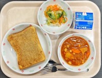 ・セサミトースト・チキンビーンズ・キャベツのサラダ・牛乳【ランチニュース】今日は...