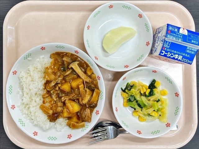 【ランチニュース】今日はおはなし給食第2弾「ひみつのカレーライス」にちなんだ給食です。ある日のカレーライスを食べていたフミオの口の中に小さな黒い粒が…それは「カレーライスのたね」でした。さっそくフミオのお父さん、お母さんと庭にたねをまきました。するとふしぎなものが次々と生えてきたのです。「カレーライスのたね」を探しながら食べてみてください。