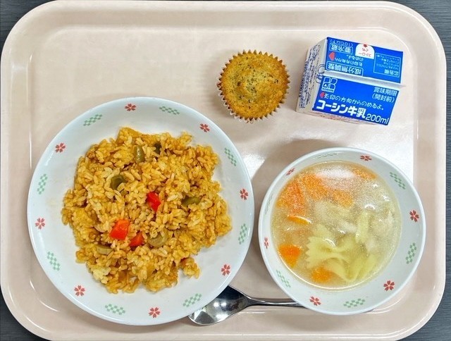 【ランチニュース】今日はおはなし給食第3弾「はらぺこあおむし」にちなんだ給食です。食いしんぼうのあおむしが葉っぱだけでなく、果物やアイス、ペロペロキャンディーなど、いろいろなものを食べて蝶になるまでのお話です。給食では、「紅茶のカップケーキ」を給食室で一つ一つ手作りしました。そして、この絵本を書いた、エリック・カールさんがアメリカ合衆国の出身であることから、アメリカの混ぜごはん「ジャンバラヤ」の登場です。スパイスとトマトの味わいが特徴的なアメリカの郷土料理を味わって食べましょう。