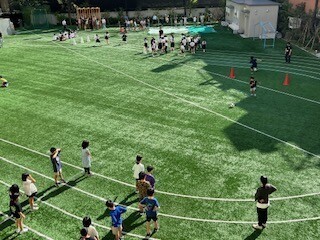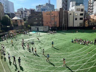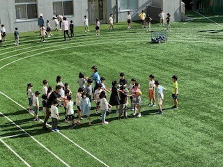 朝の時間を活用し、クラスごとにスポーツタイムに取り組みました。体をひねってボールを後ろの人に回したり歩幅を大きく走ったり、体の動かし方を意識しながら活動しました。