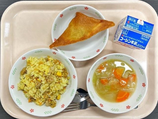 【ランチニュース】今日はインド料理です。サモサとは、春巻きの皮にカレー粉で味付けしたじゃがいもなどをつつんであげたものです。インド料理にはたくさんのスパイスが使われます。スパイスは血の流れをよくして、病気に勝てる体をつくるのにとても効果があるとされています。インド料理を味わって食べましょう。