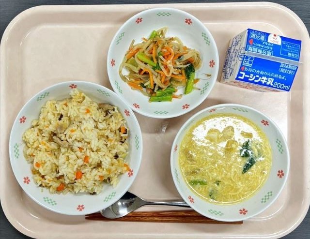 【ランチニュース】今日は「運動会前の からだづくりシリーズ」スタミナアップ献立です。スタミナチャーハンには、にんにく・豚肉・玉ねぎ・ねぎが入っています。豚肉の「ビタミンB1」は、疲れた体を元気にしてくれます。ねぎやにんにくは、その働きを助けてくれます。疲れたときは「豚肉とねぎ」! しっかり食べて、元気にすごしましょう!
