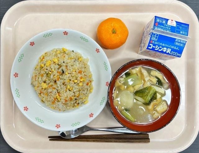 【ランチニュース】高菜は少しから味のある野菜です。漬物にした高菜漬けは九州の名物です。高菜には風邪を防ぐビタミンCがたくさん入っています。また、お腹の調子をよくする乳酸菌もできます。今日のチャーハンは、この高菜漬けを使っています。にんにくやしょうがでよい香りになるように作りました。高菜のシャキシャキした食感と味を味わって、よくかんで食べましょう。