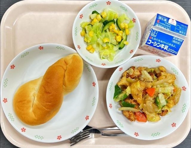【ランチニュース】今日は、キャベツときゅうりを使ったコールスローサラダです。コールスローとは、キャベツを千切りにしてドレッシングで和えるサラダのことです。キャベツやきゅうりを細く切ってあるので、とても食べやすいですね。野菜のシャキシャキとした食感を楽しみながら、よくかんで食べましょう。