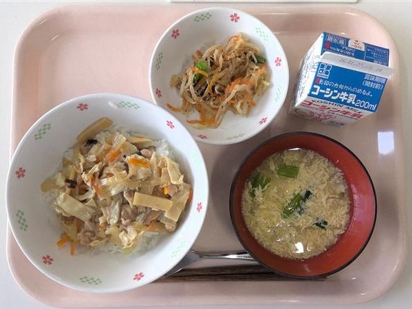 【ランチニュース】今日は栃木県の郷土料理です。主食のゆば丼に使われている「ゆば」は、豆乳を温めたときにできる膜をすくい取ったもので日光の名産として知られています。汁物のかんぴょうの卵とじ汁に使われている「かんぴょう」は、ユウガオの実を細くむいて乾燥させたもので栃木県が全国一の生産量を誇ります。「ゆば」も「かんぴょう」も食物繊維が豊富で、体の調子を整えてくれる栄養満点の食材です。今日は、栃木県の恵みを味わって食べましょう。