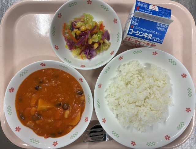 【ランチニュース】今日は、ALTの先生の母国である、南アフリカのジンバブエ共和国の献立です。この地域では、豆料理がとても有名で毎日のように食べられています。今日のビーンズトマトシチューは、豆をたっぷり使った、現地で親しまれているメニューです。今日の献立は、日曜日に家族で食べるスペシャルメニューの内容を再現したものです。ALTの先生の故郷の味を味わって食べましょう。