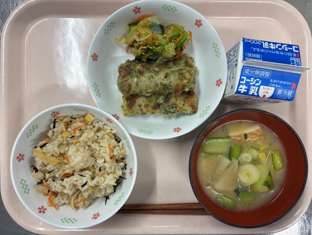 【ランチニュース】ひじきは海で育つ、栄養たっぷりの食べ物です。みなさんの骨を強くしたり、血をきれいにしてくれる力があります。今日は、そんなひじきをごはんに混ぜておいしく炊き上げました。体によい栄養がたっぷりつまったひじきを残さず食べて元気な体を作りましょう。