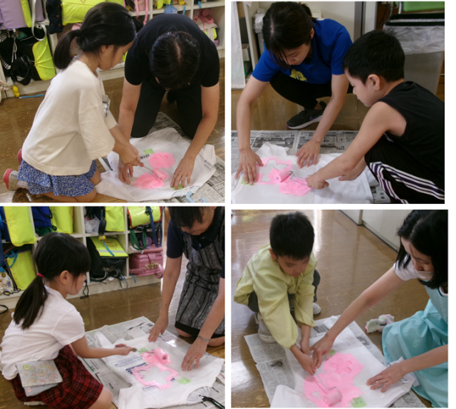 子どもたちが持ってきた白無地Tシャツの背中部分に先生たちが桜の花びらの形をくり抜いたクリアファイルを慎重に置き、その上から子どもたちがローラーで絵具をのせていきます。最後に型紙のクリアファイルをはがすと、きれいな桜が現れました。1組と3組はピンク、2組は水色の絵具で花を咲かせました。運動会の新名称「さくらフェスティバル」にもマッチしたかわいいTシャツの完成です。