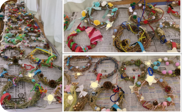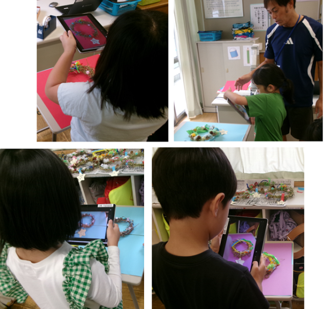 完成品は、子どもたちがそれぞれ撮影しました。タブレットのカメラを起動して写真を撮るのも手慣れたものでした。リースは後で各自の家に持ち帰る予定です。