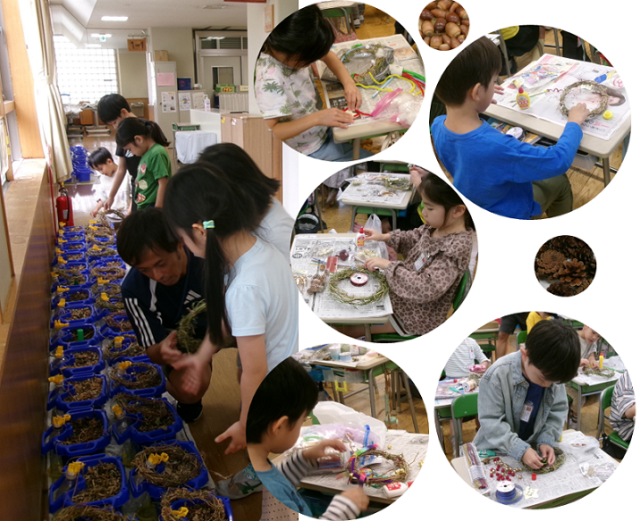 この夏に子どもたちが世話をして花をたくさん咲かせた朝顔たち。秋になって枯れてもリースの土台として生まれ変わりました。土台となる輪の部分は支援員さんが作ってくれましたが、その上に飾り付けたのは子どもたちです。木の実、リボン、造花など各自が好みの材料を持ってきて、ボンドや糸で付けていきました。色や素材の組合せを工夫して、それぞれの個性が溢れる作品の誕生です。