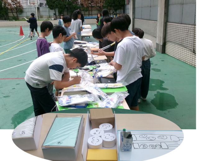 授業の前半は校庭で水鉄砲や空気鉄砲、注射器を使って、その中に閉じ込めた空気や水を圧すと体積と圧し返す力がどのように変化するか、空気と水の違いにも注目しながら実験しました。実験道具や実験の進め方を子どもたちが主体的に選べるよう複数のブースが用意されていました。子どもたちはそれぞれの方法で課題に向き合い、実験からの考察や気づきをイメージ図などで確認しながら、ノートやタブレットに書き込みました。