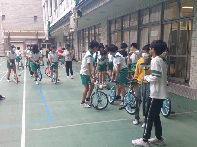 本校では休み時間などに自由に遊べるように、職員室の外壁沿いに一輪車や竹馬などの遊具が並べられています。また、逆上がり用の補助器具も置かれています。さくらフェスティバルでその場所は本部や来賓席、参観スペースとなるため、遊具を一時的に移動しました。