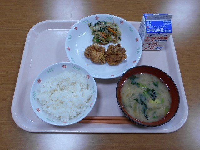 牛乳、ご飯、鶏のから揚げ、キャベツのおかか炒め、さつま芋のみそ汁