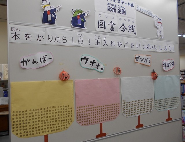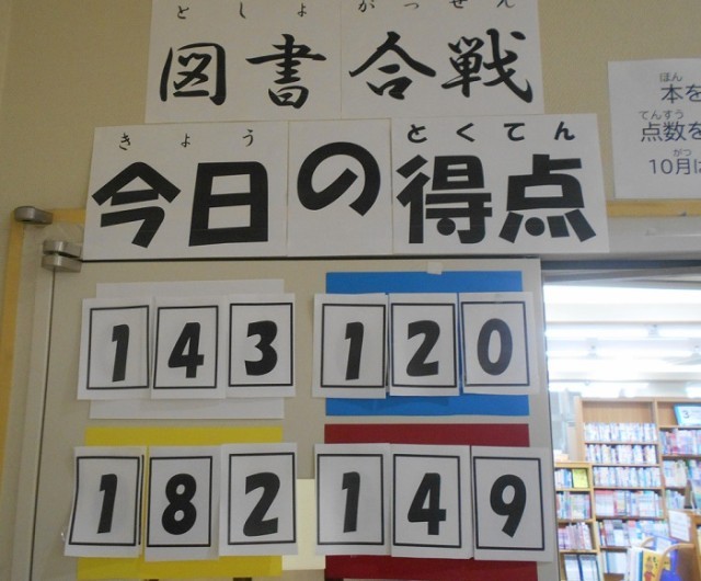 図書館前に貼られたボードによると182点で10月23日(木)の取材時点では黄色チームが一歩リードしていました。フェスティバルまでに逆転があるのか、本番の競技での勝敗との違いはあるのか興味は尽きません。フェスティバルまであと少しの時間です。本をたくさん読んで読書でもさくらフェスティバルを応援できるとより楽しめると思います。