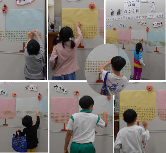 図書館もこの新企画に呼応して、9月下旬から「さくらフェスティバル応援企画」で「図書合戦」を実施しています。子どもたちは本を借りると、色別のバスケットの中から自分のチームカラーを選んで、ゴールドの丸いシールを貼ることができます。玉入れゲームのようで楽しい企画で、図書の時間や休み時間に子どもたちが次々とシールを貼っていきます。