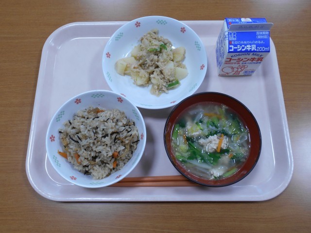 牛乳、ひじきご飯、ツナじゃが炒め、鶏団子入り塩ちゃんこスープ