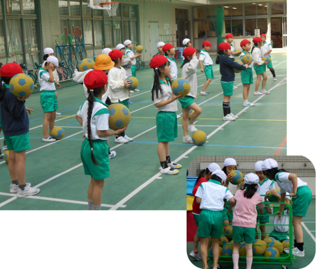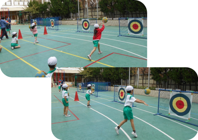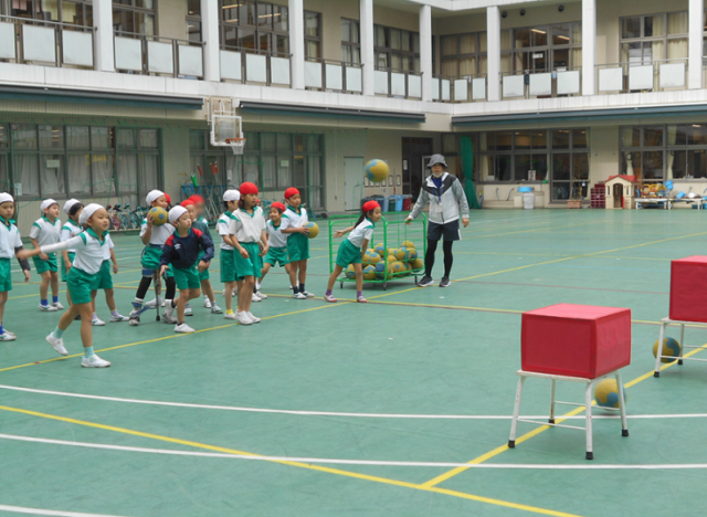 少しでもボールに慣れるよう、できるだけ遠くに投げる練習、八の字ボール回しなどのハンドリング練習、ペアでの両手投げ練習などを先生が指導しました。最後は的にボールを当てる練習で、近距離から始めて徐々に的との距離を離していきました。的の中心に近いほど高得点で、子どもたちは真剣になって真ん中を狙って投げていました。