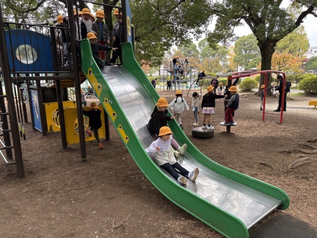 11時頃に見学を終えた後は、隣接の公園で一遊び。急勾配の滑り台やジャングルジムなど、学校にはない遊具や広い場所での鬼ごっこなどをして、思いきり楽しく遊びました。