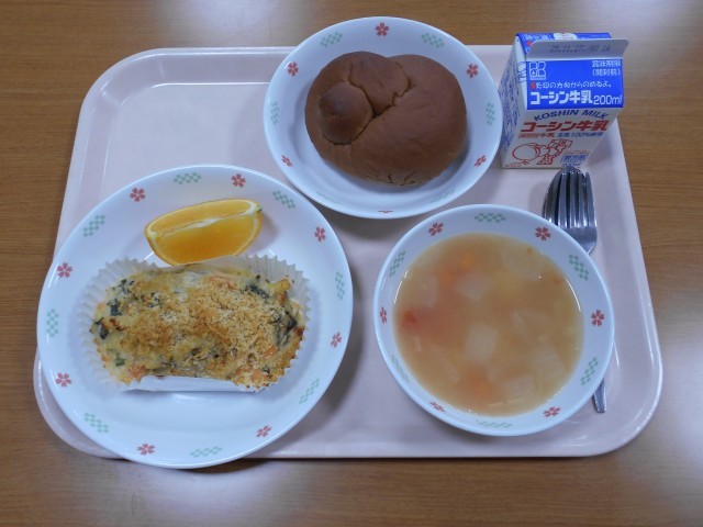 牛乳、ココアパン、サーモングラタン、マセドアンスープ、夢オレンジ
