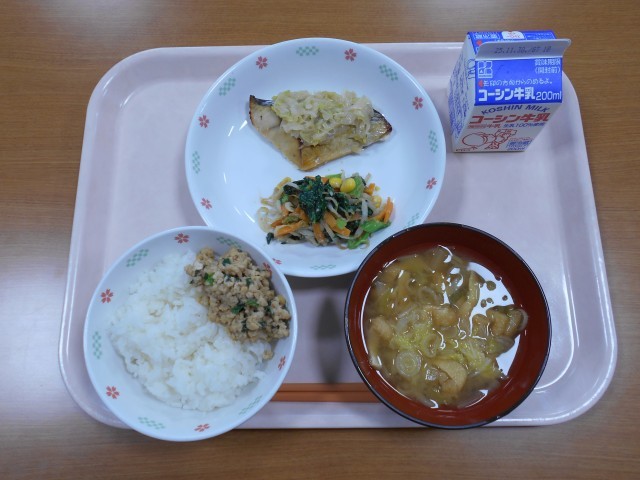 牛乳、ご飯、スタミナ納豆、鯖のねぎ塩焼き、小松菜のごま和え、白菜のみそ汁