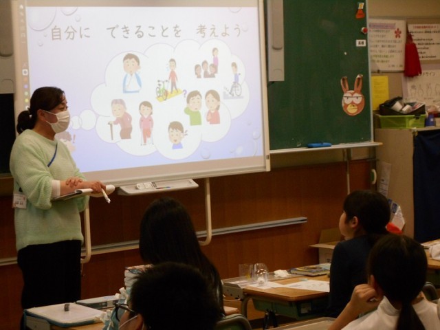 けがをしている人、持病のある人、赤ちゃんを連れている人、難聴の人、さらにコミュニケーションで困っている人の例も挙げながら、それぞれ何ができるか、どんなふうに接するかをワークシートに書き込みました。コミュニケーションに関しては、ゆっくり大きい声で話す、手話を活用するといった意見が出されました。困っている人に対して「思いやりをもつ」ことの大切さを指摘する意見もありました。