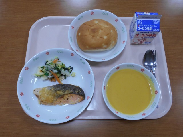 牛乳、パインパン、鱒の香草焼き、アップルサラダ、緑黄色野菜のポタージュ