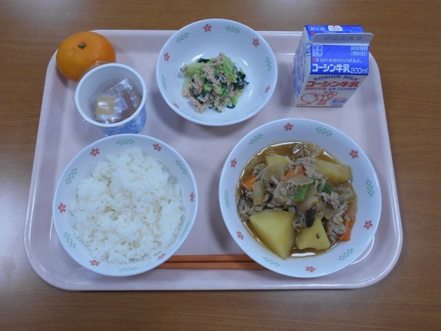 牛乳、ご飯、納豆、肉じゃが、小松菜のツナ和え、みかん
