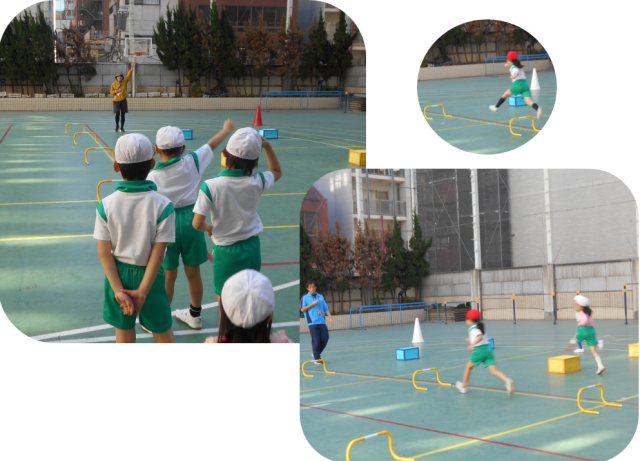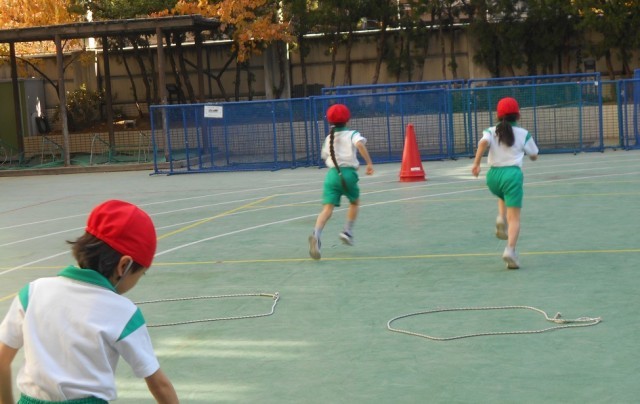 朝夕の気温がぐっと下がり、冬の気配が色濃くなってきましたが、子どもたちは元気に校庭で運動しています。12月1日(月)、1年生はミニ・ハードルなどを使った障害物走の練習に初めて取り組みました。