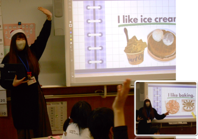 ALTの先生は、3組の子どもたちがすでに習った「have」と「like」を使って自己紹介。先生の出身地にある施設や自分の好きな物や事などを英語で紹介しました。先生はケーキ作りが好きだそうですよ。