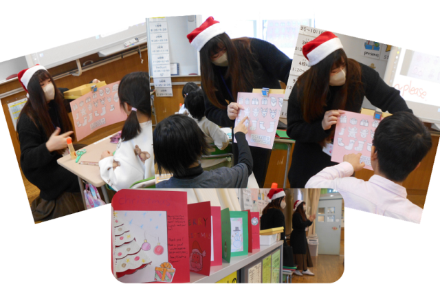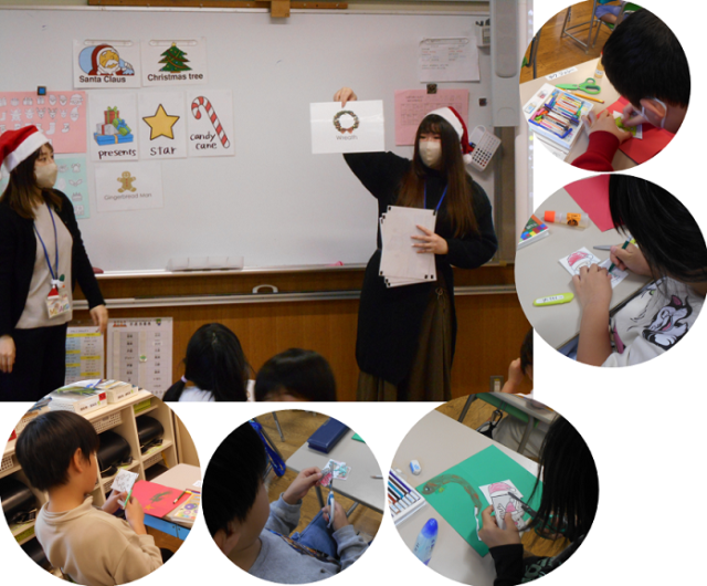 クリスマス関連の授業では、英語の歌を歌ったり、クリスマスでよく使う単語や表現を口頭で練習したりしました。その単語をイラスト化したものから子どもたちがそれぞれ好みの2点を選び、クリスマス・カード制作に取り組みました。色を塗ったり、形に添って切り抜いて台紙に貼りつけ、独自の絵も追加していました。