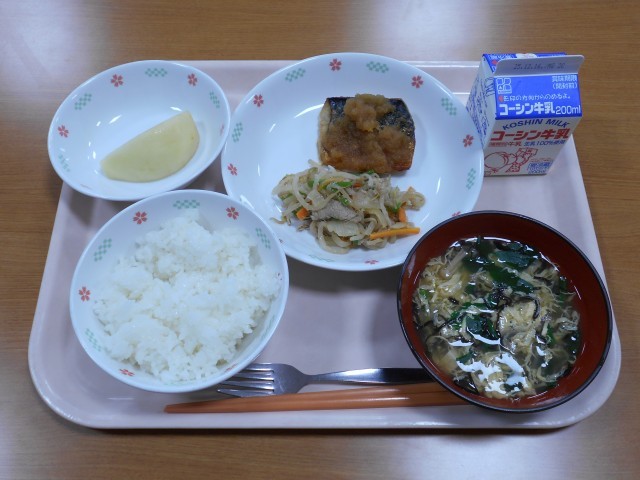 牛乳、ご飯、鯖のみぞれ焼き、もやしのごま炒め、かきたま汁、洋梨