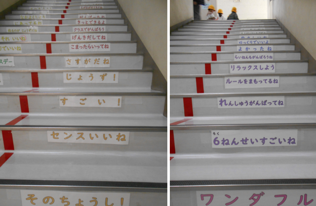 「わあ、すごい!」、「全部違う言葉だ」と階段の掲示を見付けた子どもたちは興味深げに言葉を読みながら上りました。中には読むのに夢中で、階段を上るのがゆっくりになる子も。