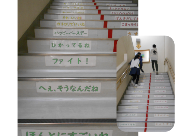 11月のふれあい月間(いじめ防止強化月間)に、人権教育の取組の一環として、本校では子どもたち一人一人が考えた「あったかことば50音一覧表」を作りました。12月4日(木)、そのあったかことばを50音順に階段の一段ごとに掲示し、歩を進めるごとに温かいことばに出会えるようにしています。