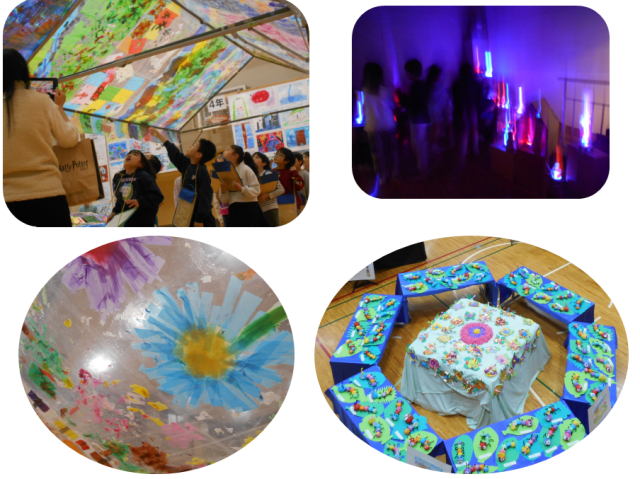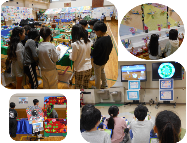 体育館いっぱいに展示された作品群は圧巻で、子どもたちが制作にかけた情熱が会場全体にみなぎっています。エレベーター近くの資料展示コーナーや廊下も使って、図工も手芸もアニメーション作品も含めた大きなアートゾーンが出現しました。