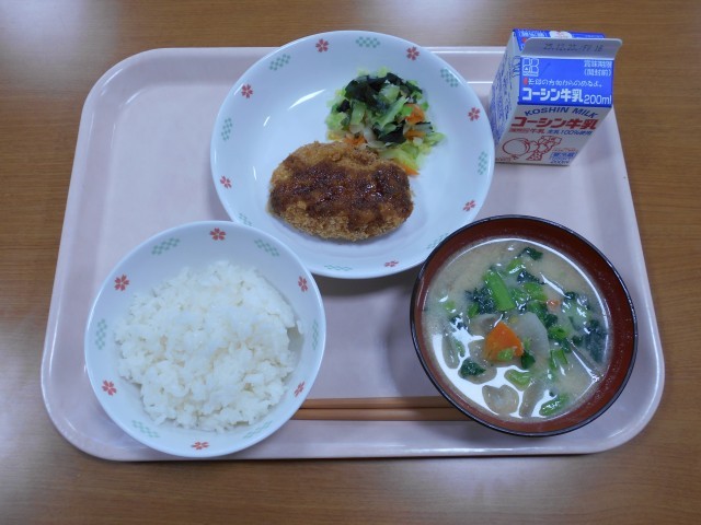 牛乳、ご飯、金時豆入りメンチカツ、きゃべつの甘酢和え、さつま汁