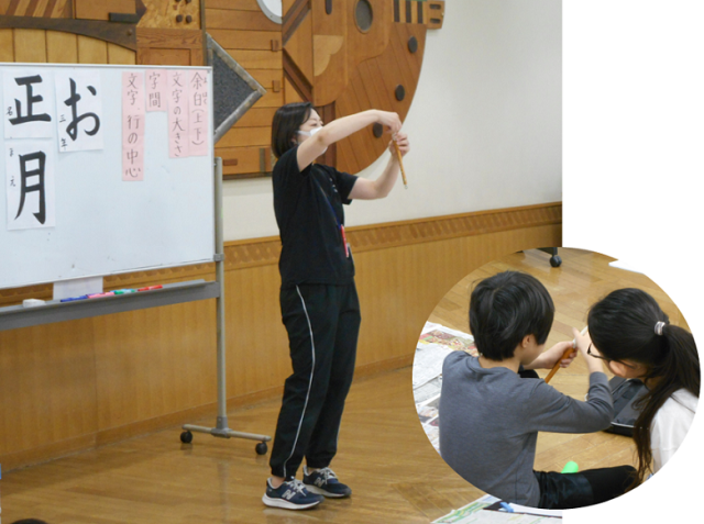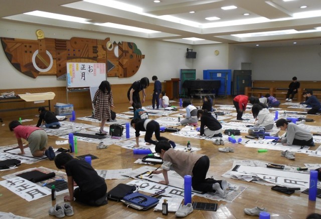 本番用の半紙が配られ、「姿勢を正しくするのが大事」と書写の先生から指導されるとみんな正座モードになり、集中力を高めて「お正月」の文字を書いていました。