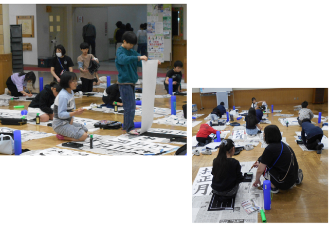 長い書き初め用の半紙に書くのは初めてです。新しいだるま筆をおろすのは比較的スムーズにできましたが、長い用紙の扱いに戸惑ったり、長い紙に足がのるのを恐れて紙の横から書いたり、独特のスタイルで書く子もいました。